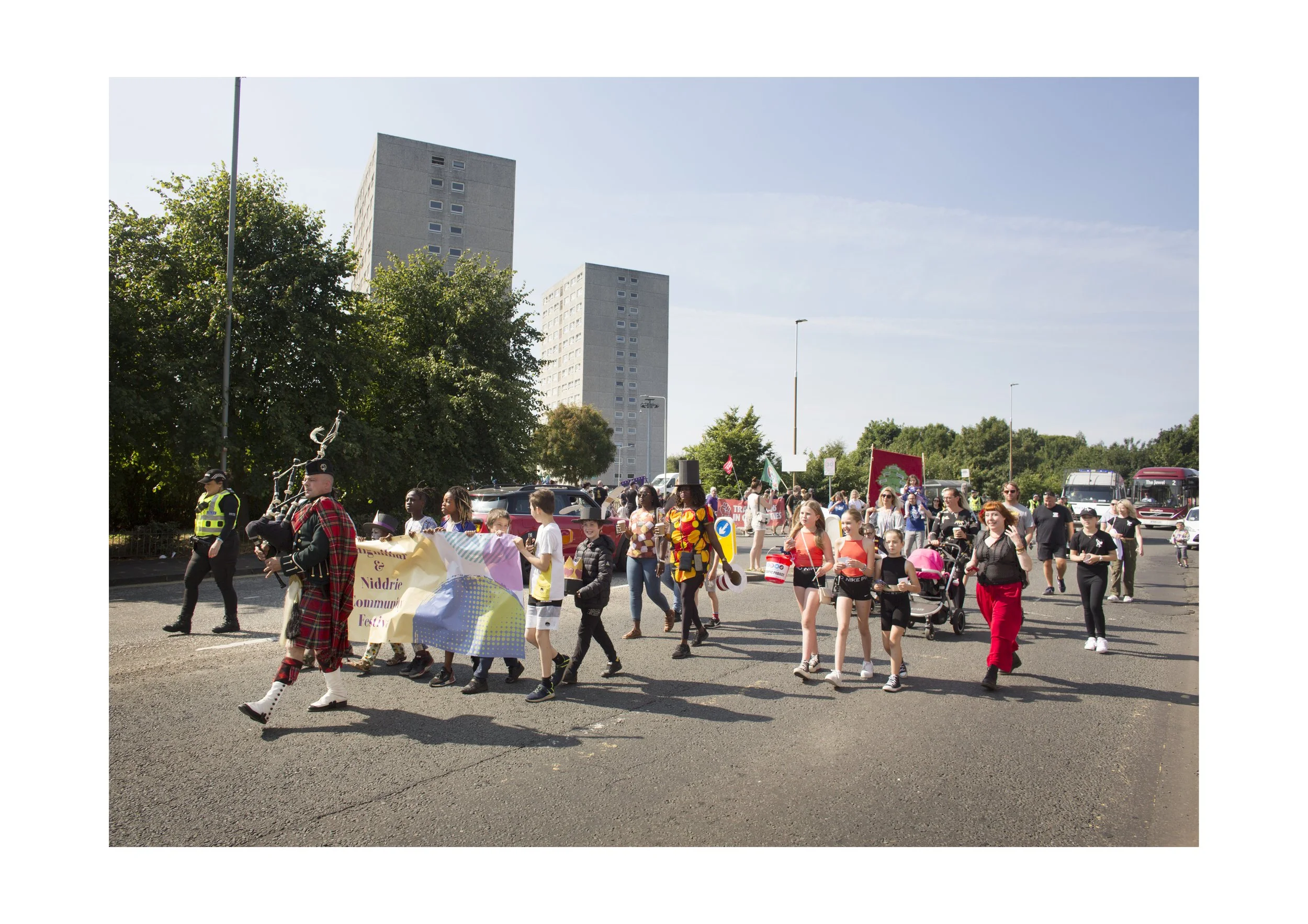 Image Description: Colour photograph of parade procession, with a piper leading. The piper is dressed in a red tartan kilt, green jacket, and black hat, and is playing blue bagpipes. Behind him, a group of children walk carrying a banner with “Craigmillar & Niddrie Community Festival” on it. Behind them walk parents in costume, Starpic’s young dancers, and other community members.